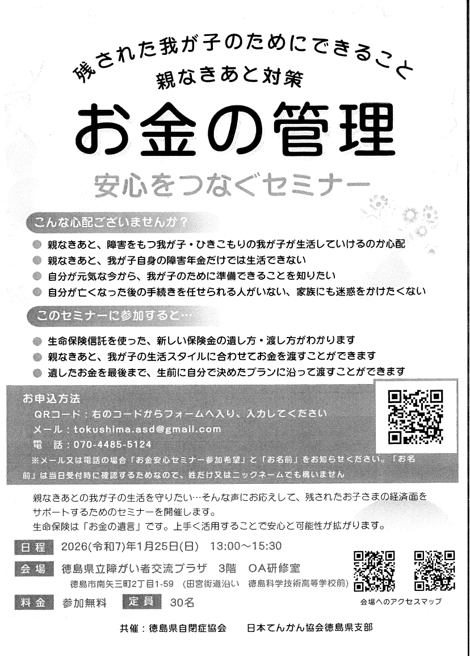 2026年1月25日(日)に、徳島県立障がい者交流プラザにて、『親なきあと対策 お金の管理 安心をつなぐセミナー』が開催されます。