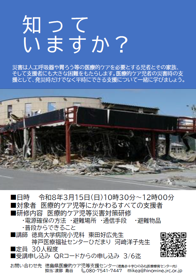 令和8年3月15日(日)に徳島赤十字ひのみね医療療育センターにて、医療的ケア児等災害対策研修が行われます。 参加ご希望の方は、申込が必要になります。(3月6日まで)
