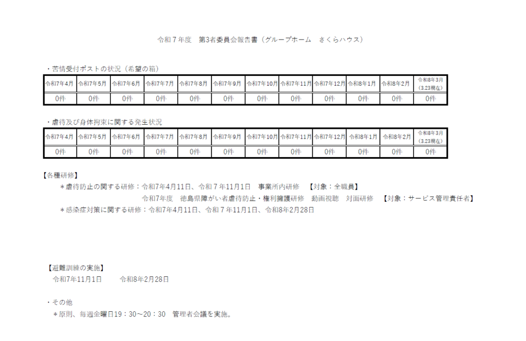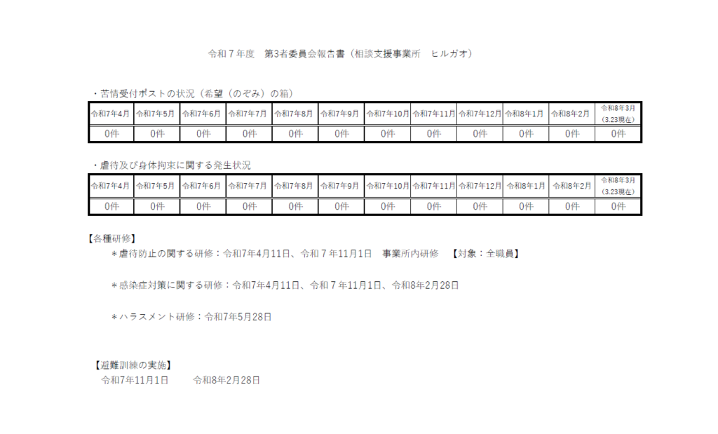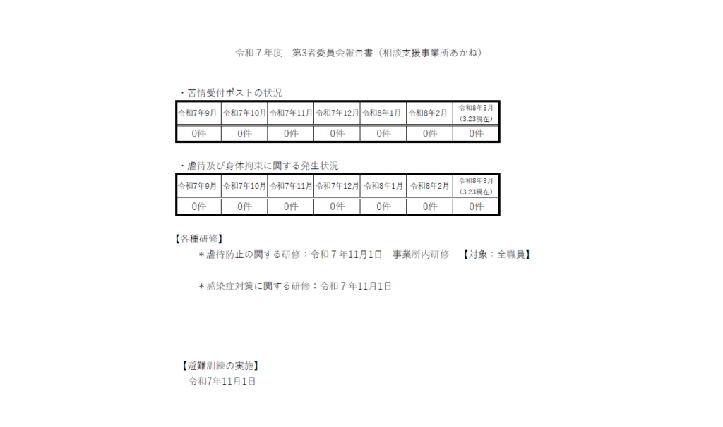 当社にては2回目の苦情解決第三者委員会であったが、書類作成の面など概ね問題ないため、この調子で運営にあたって下さいとの言葉をいただいた。