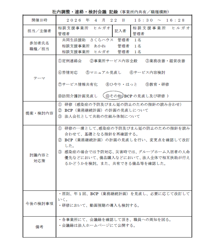未分類令和8年4月22日にグループホームさくらハウスにて、合同会社Encourageにおける令和8年度BCP会議を開催。以下のBCP会議記録にて報告。